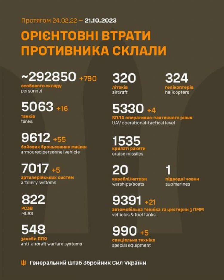 Ukrayna Genelkurmay Başkanlığı, Rus saldırılarının ilk günü olan 24 Şubat 2022'den 21 Ekim 2023'e kadar imha edilen Rus teçhizatı ve asker kayıplarını sıraladı: