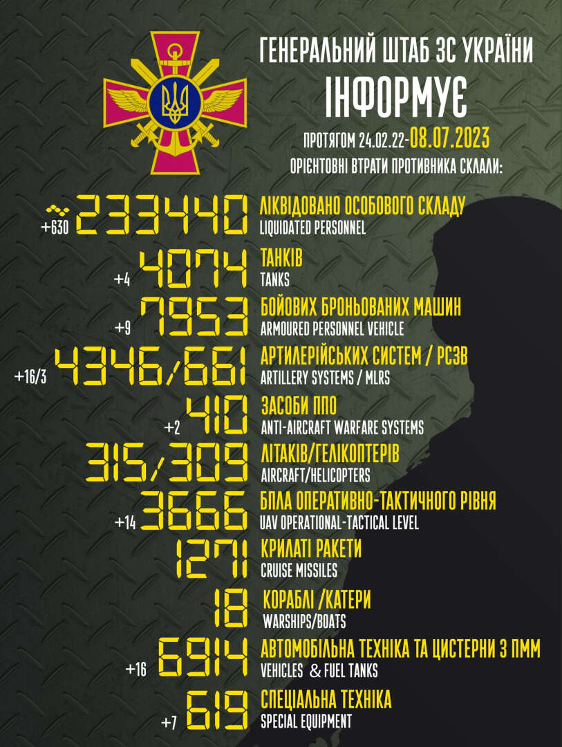 Ukrayna Genelkurmay Başkanlığının açıklamasına göre Rusya, 24 Şubat 2022’den bu yana Ukrayna’da; 4 bin 74 tank, 7 bin 953 zırhlı araç, 4 bin 346 topçu sistemi, 661 çoklu roketatar sistemi, 410 hava savunma sistemi, 315 savaş uçağı, 309 helikopter, 3 bin 666 taktik SİHA, 18 gemi, 619 özel askeri teçhizat kaybetti.