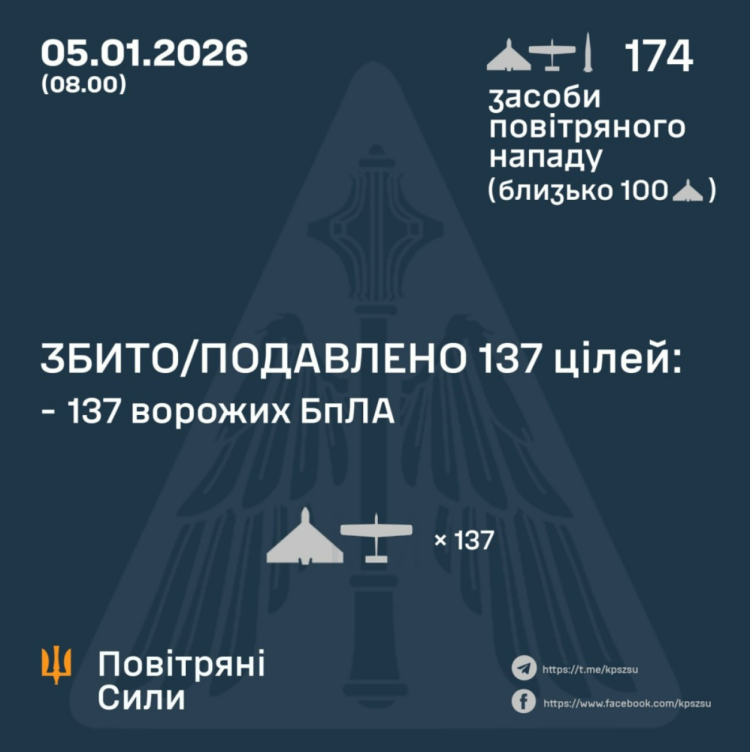 Rus saldırılarını hava savunma sistemleri, uçaksavar füzeler, elektronik harp sistemleri, insansız sistem üniteleri ve mobil ateş gruplarıyla başarıyla etkisiz hâle getiren Ukrayna Hava Kuvvetlerinin 5 Ocak 2026 tarihinde yerel saate göre 08.00 itibarıyla, 137 Rus SİHA’sını etkisiz hâle getirdiği belirtildi.