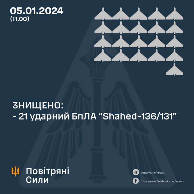 İşgalci Rusya, 4 Ocak’ı 5 Ocak’a bağlayan gece, Ukrayna’nın farklı bölgelerine İran yapımı kamikaze silahlı insansız hava araçları (SİHA) ile saldırı düzenledi. Ukrayna ordusu, işgalcilere ait 21 SİHA'yı düşürdü.