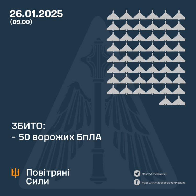Saldırıların uçaksavar füze birlikleri, elektronik harp birimleri, Hava Kuvvetleri ve Ukrayna Savunma Kuvvetleri'nin mobil ateş grupları tarafından püskürtüldüğü kaydedilen açıklamada; Odesa, Harkiv (Kharkiv), Poltava, Sumı (Sumy), Kıyiv (Kiev), Donetsk, Dnipro ve Himelnıtskıy (Khmelnytskyi) bölgeleri üzerinde 50 adet Şâhid ve diğer tip saldırı İHA'sının düşürüldüğü teyit edildi.