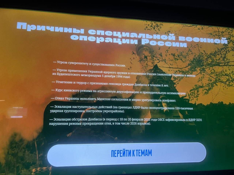 Hareket tarafından yapılan açıklamada, Alçevskli öğrencilerin 'Kahramanlık ve İhanet' başlıklı bir sergiyi ziyaret etmeleri için organize edildikleri kaydedildi. Açıklamada, sergi hakkında "Bu sergi aslında bir dizi yüksek sesli slogan ve şüpheli sahtecilikten oluşuyor: Ukrayna Halk Cumhuriyeti'nin tarihinin çarpıtılmış bir anlatımı, Ukrayna'nın işgalinin nedeni olarak 'Rusya'nın egemenliğine yönelik tehdit' hakkındaki fanteziler ve kurgusal hikayeler... Bazı slaytlar, 'terörizmin' kanıtı olarak sunulan Ukrayna sembolleri içeren grafitilerle süslenmiştir." ifadeleri kullanıldı.