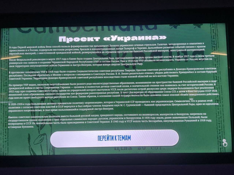 Aynı zamanda sergideki slaytların metninde Ukrayna'nın Rusya'ya karşı nükleer silah kullanma tehdidinde bulunmakla suçlandığı bilgisinin yer aldığını belirten hareket, bu tezin kanıtı olarak Ukrayna'nın Budapeşte Memorandumu'ndan çekildiğine ilişkin açıklamanın gösterildiğini aktardı. Aktivistler, konuyla ilgili olarak "Ukrayna parlamentosunda böyle bir 'bildirinin' gündeme bile gelmediği gerçeğini hesaba katmadan bile, Rus propagandacıların nasıl olup da Rusya'nın Ukrayna'nın toprak bütünlüğünün garantörlerinden biri olduğu Budapeşte Memorandumu'ndan bahsetme cüretini gösterdikleri kesinlikle anlaşılır gibi değil..." şeklinde açıklama yaptı.